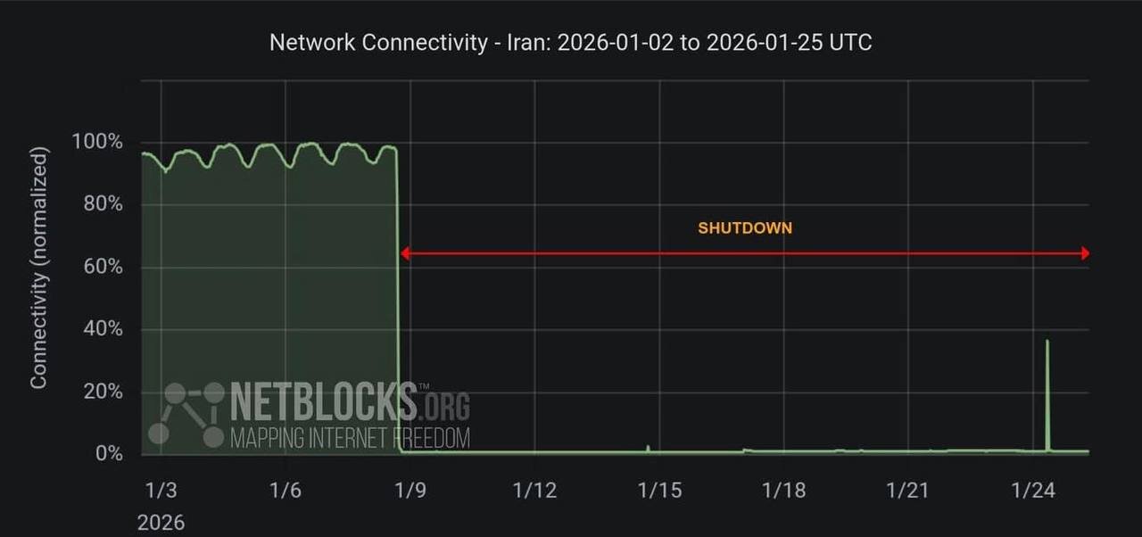 به گزارش خبرگزاری آفتابنگاران، ٖاین نمودار که کاهش سطح دسترسی به اینترنت بینالملل را به سطحی نزدیک به صفر نشان میدهد، بیانگر یکی از طولانیترین و عمیقترین اختلالات ارتباطی در تاریخ کشور است.