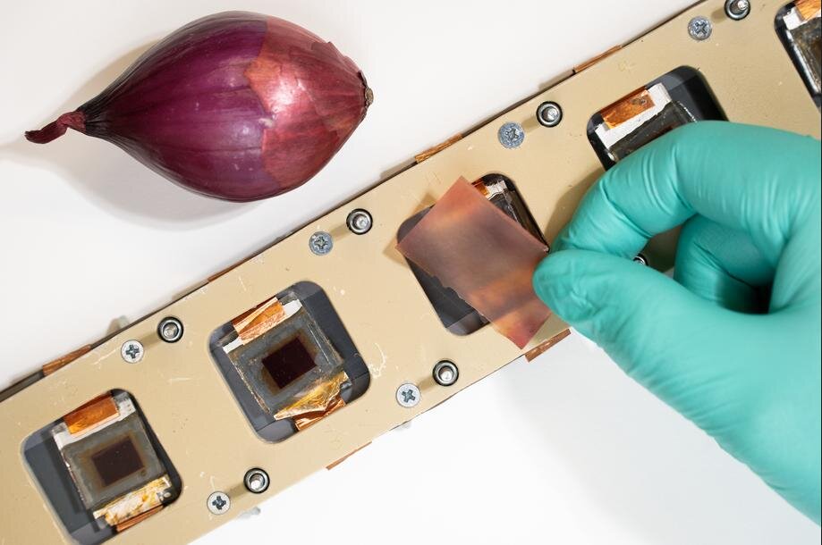 اکنون دانشمندان با الهام از طبیعت توانستهاند لایه شفافی از نانوسلولز (ساخته شده از منابع گیاهی) تولید کنند و آن را با رنگدانههای استخراجشده از پوست پیاز قرمز رنگآمیزی کنند. این لایه توانست تا ۹۹.۹ درصد پرتوهای فرابنفش تا طول موج ۴۰۰ نانومتر را مسدود کند، و در عین حال بیش از ۸۰ درصد نور مرئی و فروسرخ نزدیک (۶۵۰ تا ۱۱۰۰ نانومتر) را عبور داد که برای تولید برق در سلولها حیاتی است.